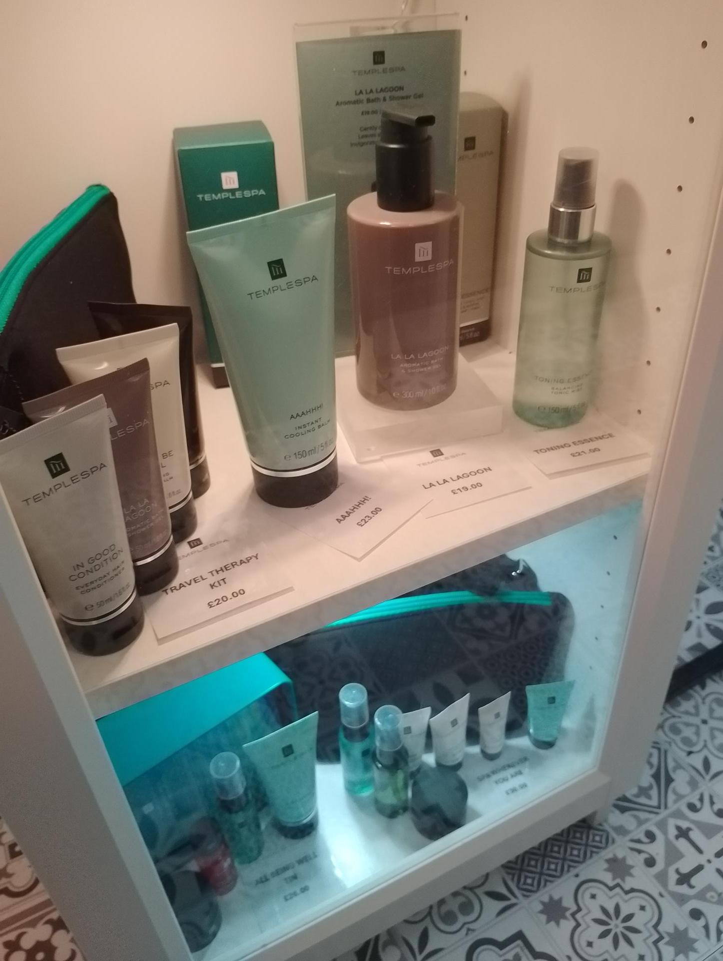 We have a number of Temple Spa cosmetics and toiletries for sale as well as travel sets and gift sets. These are shown in our display cabinet in the hallway, and we regularly have special promotions and discounted items for guests to purchase as a souvenir of their visit or a gift for someone special!